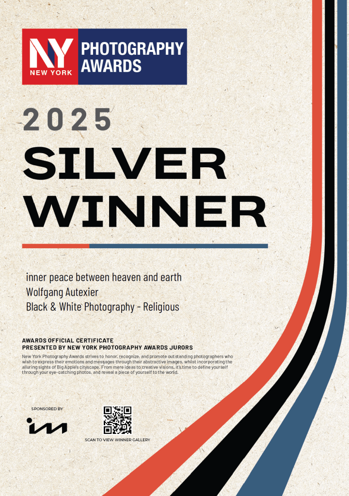 Cet été, les EPA (Européen photo Awards) m’avait attribué 4 Premiers Prix dans 4 catégories pour cette même œuvre. Cette fois-ci, la portée n’est pas dans le nombre ou le rang des récompenses, mais dans l’une des 4 catégories de récompenses. En effet, la catégorie « Black & White Photography » sous-catégorie « Religious » a un sens particulier ici. La catégorie « religieuse » est rare dans les compétions. La médaille d’argent ici attribuée en catégorie « religieuse » marque la pleine et entière adhésion du jury a cette œuvre en qualité d’œuvre spirituelle. Un tel plébiscite est une bénédiction.