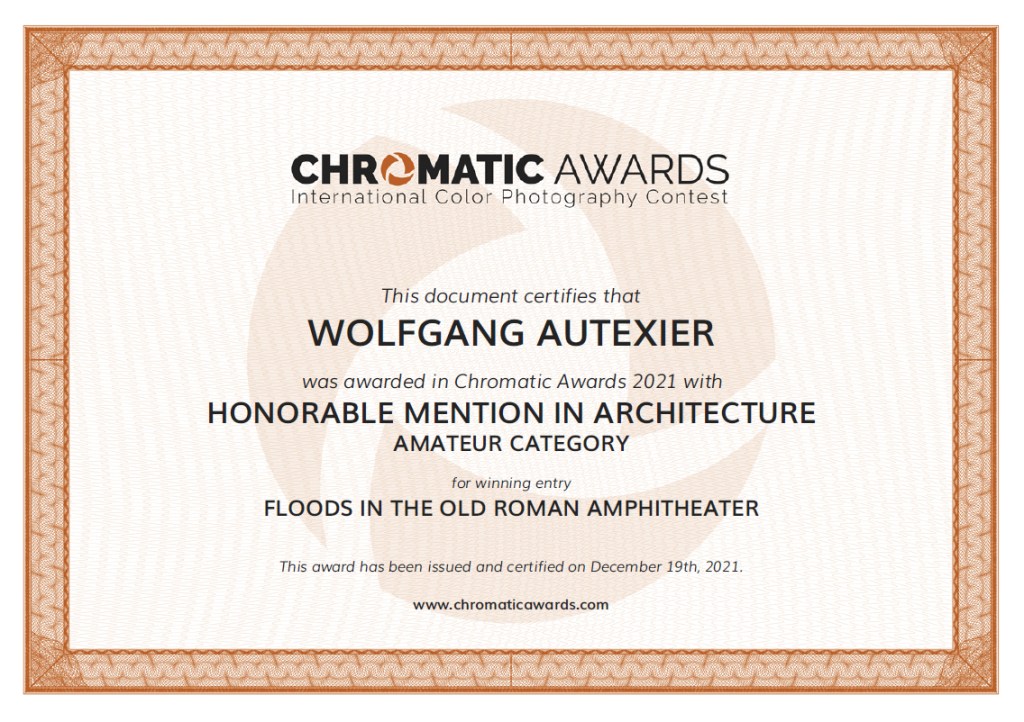 En catégorie Architecture, j’avais deux œuvres engagées, les deux sont récompensées d’une mention honorable, respectivement aux 6eme et 7eme places sur 104 finalistes. Il s’agit la de deux photographie de la série Aqua Arena, reportage sur les Arènes de Saintes lors des crues de la Charente, déjà plusieurs fois récompensées en 2021 et début 2022. Bref : ici on confirme le statut de deux œuvres déjà reconnues. [voir Aqua Arena & Aqua Arena Milky Way]