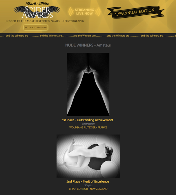Extrait de la liste d’annonce de la catégorie nu de 17eme Black and White Spider Awards. « Abstraction » réalisée avec Ophélie reçoit le premier prix. [voir l’annonce du palmarès]